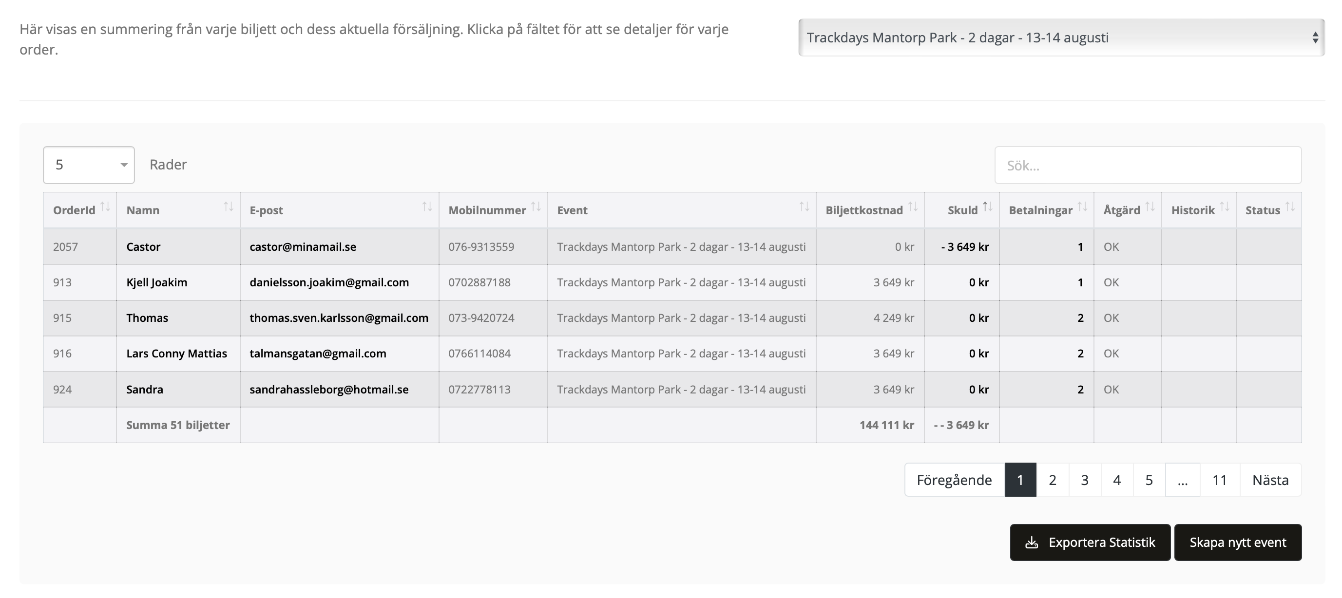 För att snabbt se vad kunderna har för innestående skuld (i detta fall delbetalning som återstår) så kan du snabbt se denna information. Denna information går också att exportera. Överst kan du välja vilket event det gäller och enklast är att sortera på skuld-kolumnen för att se vilka kunden som inte har betalt. Står det 0, så är skulden reglerad och biljetten är betald till fullo.