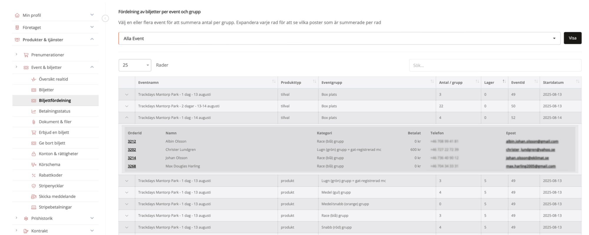 För varje biljett så kan du skapa produkter, tillbehör eller kostnader. För produkter och tillbehör vill man ibland hålla reda på hur många produkter eller tillbehör som finns per biljett. Denna vy visar antalet summerade köpta eller inlagda produkter och tillbehör. Till vänster kan du expandera varje rad - och finns det information så kommer den att visa vilka personer det är som har köpt respektive produkt för ett event som i detta fall.