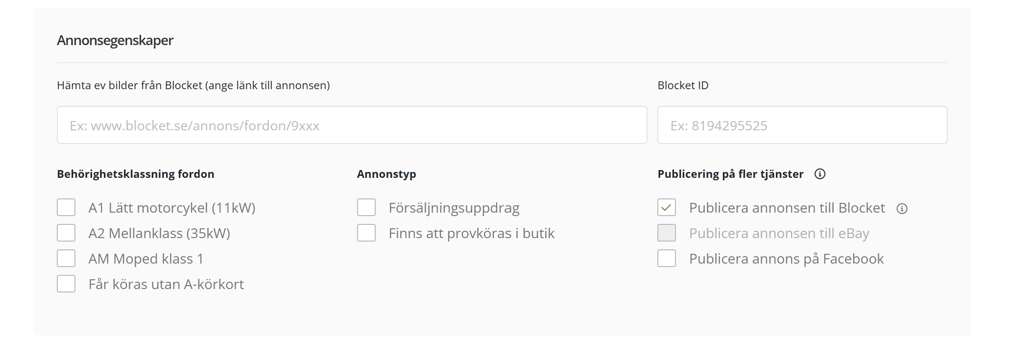 1. Markera fältet "publicera till blocket" för att skapa annonsen på Blocket också