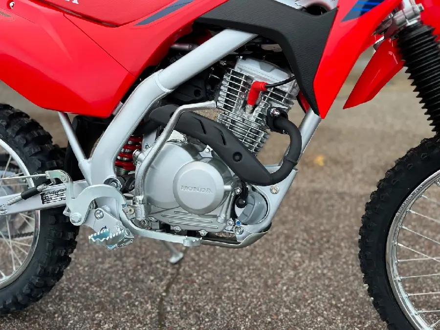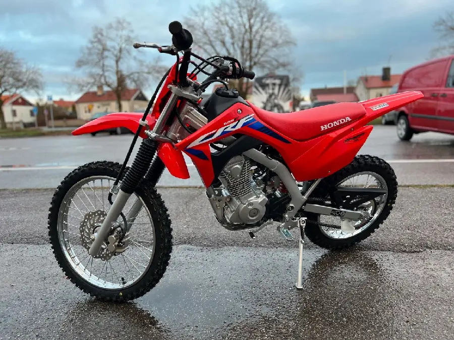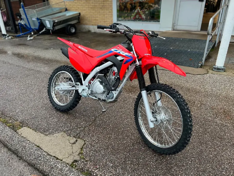 Till 2023 har CRF125 F en stilren färgsättning i helrött med dekaler i HRC-färgerna precis som de större crossar