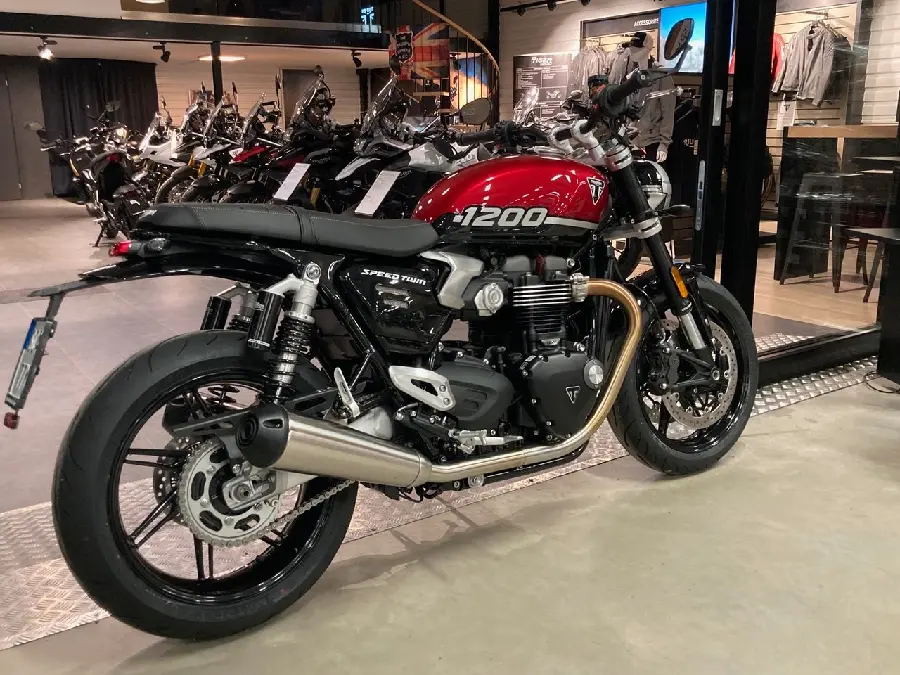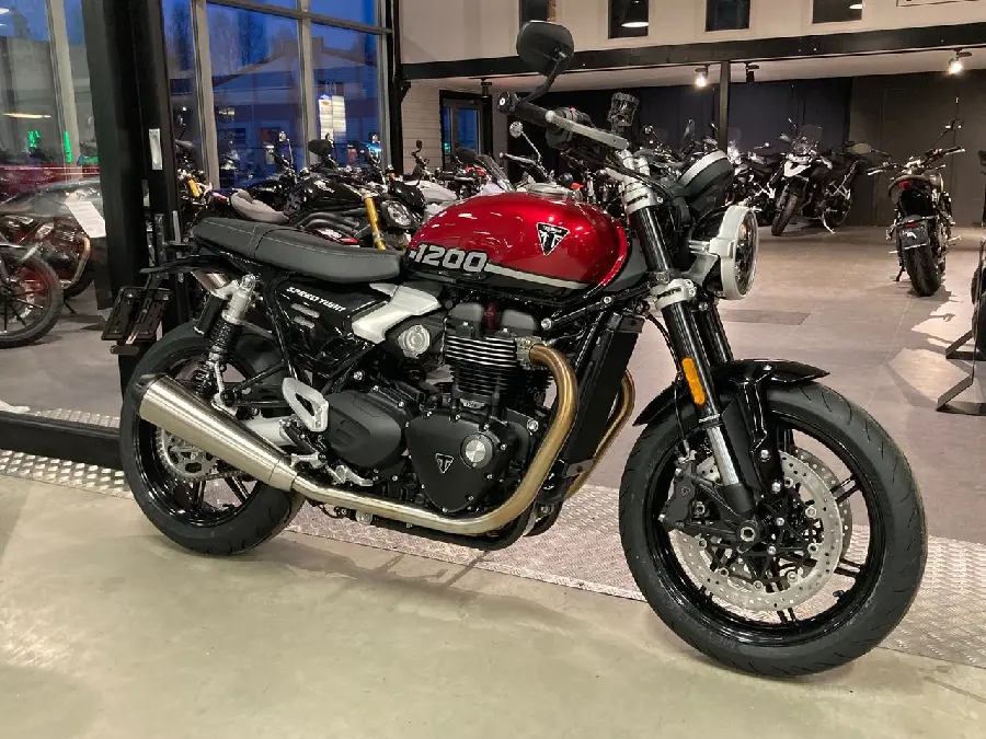 Nya Triumph Speed 1200 MY-25 i färgen Carnival Red / Sapphire Black TILL DEMOPRIS 27MIL . Utrustad med Optimised Cornering ABS and Traction Control - LED headlights with DRL - 2 riding modes (Road, Rain) - Cockpit mounted USB-C Socket.
