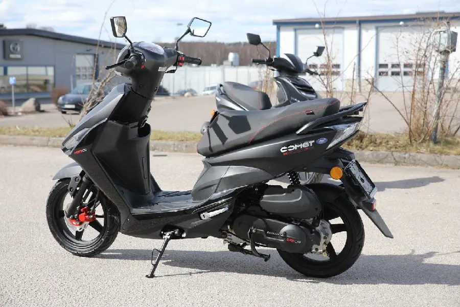 MotoCR Comet är flexibel som få och finns både som klass 1 och klass 2-moped. SP är den påkostade versionen med 12-tums hjul och USB-uttag med laddning. Sidostöd .