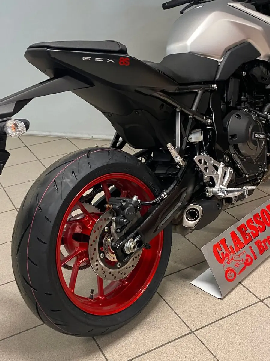 – Den futuristiska och avskalade designen går igen över hela hojen, från den spetsiga strålkastarkåpan och de lika spetsiga, framåtsträvande kylarkåporna till den minimala bakändan och den korta ljuddämparen. Det är ett slimmat, sportigt och aggressivt intryck man får av GSX-8S.