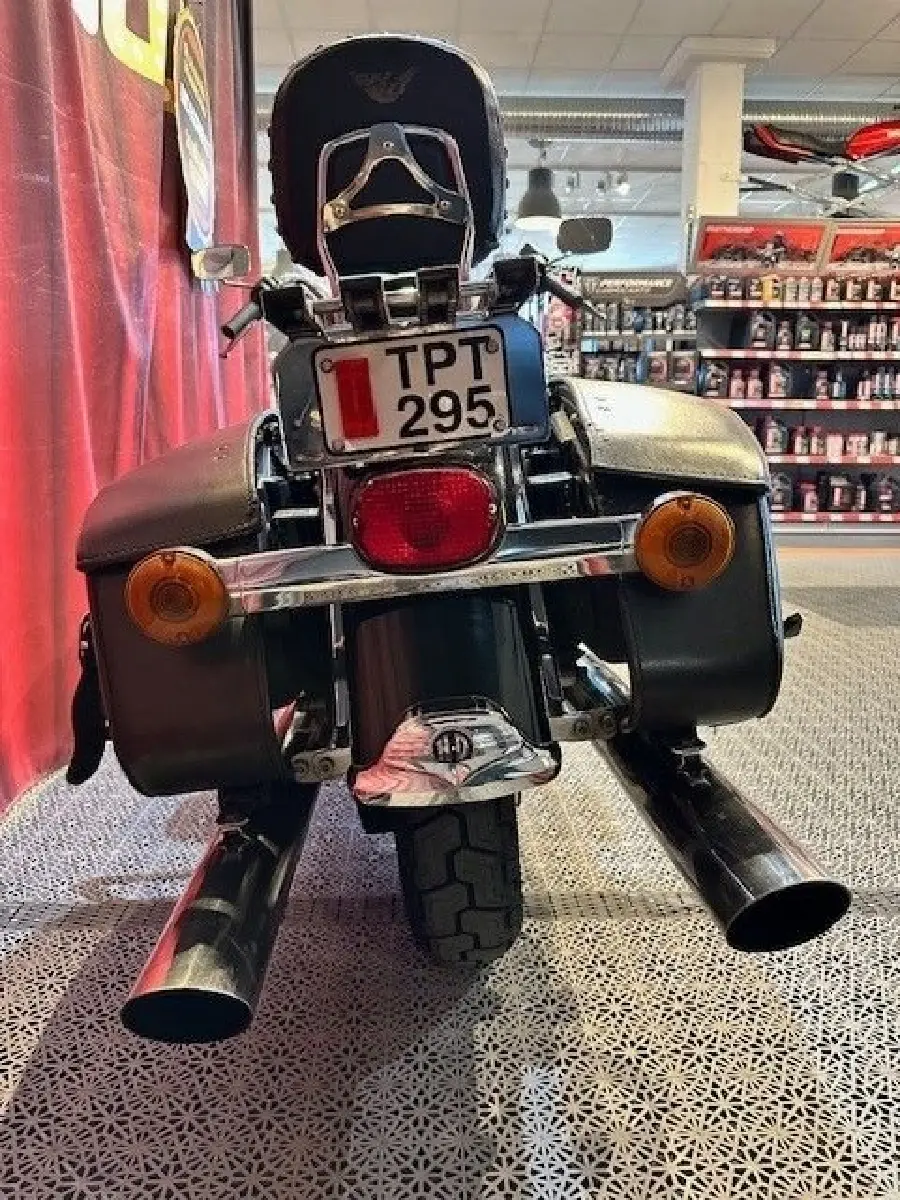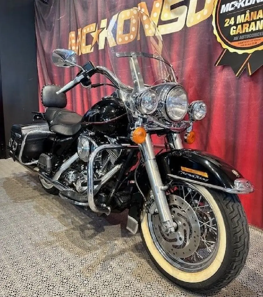Road King Classic med slip-on för det rätta ljudet! En härlig touring-maskin där du har all utrustning klar från start. Ett skönt ryggstöd för passageraren, en hög ruta för de långa turerna, och både pakethållare och stabila väskor i skinn för bra packmöjligheter. Levereras nybesiktigad och nyservad!