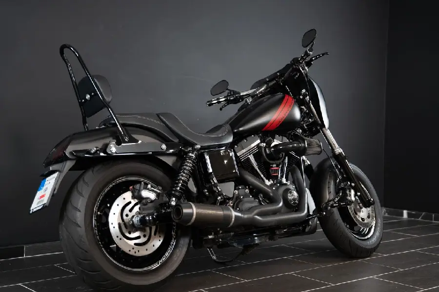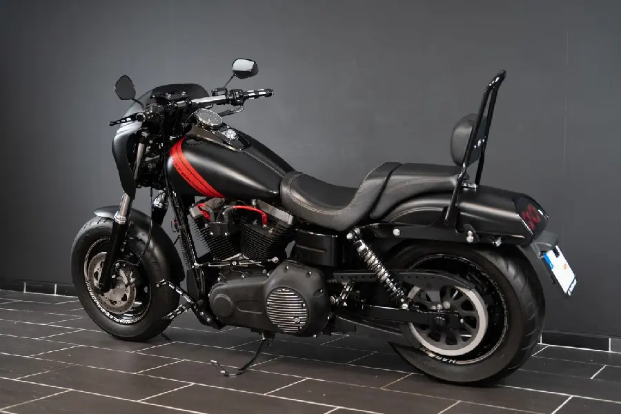 En riktigt häftig Fat Bob på Dyna-chassit med en 103" Twin Cam. Den har luft och buller med ett 2-1 Helsystem och ett KN Heavy Breather Luftfilter. Den har fått en kåpa framtill som ger en maffig look. Slimmad med miniblinkers bak. Miniblinkers fram är gömt i ändarna på handtagen. Sissybar med snabbfäste så att passageraren kan åka avslappnat. Fotpinnar, handtag, växelpinnen, kopplings-&broms-handtag går i samma HD Edge Cut serie. Den har nyligen renoverats för över 15 000:- med ny 4000-mil service, nytt styrlager, nytt bakdäck, nybesiktad och fått en genomgången ny rekond.
