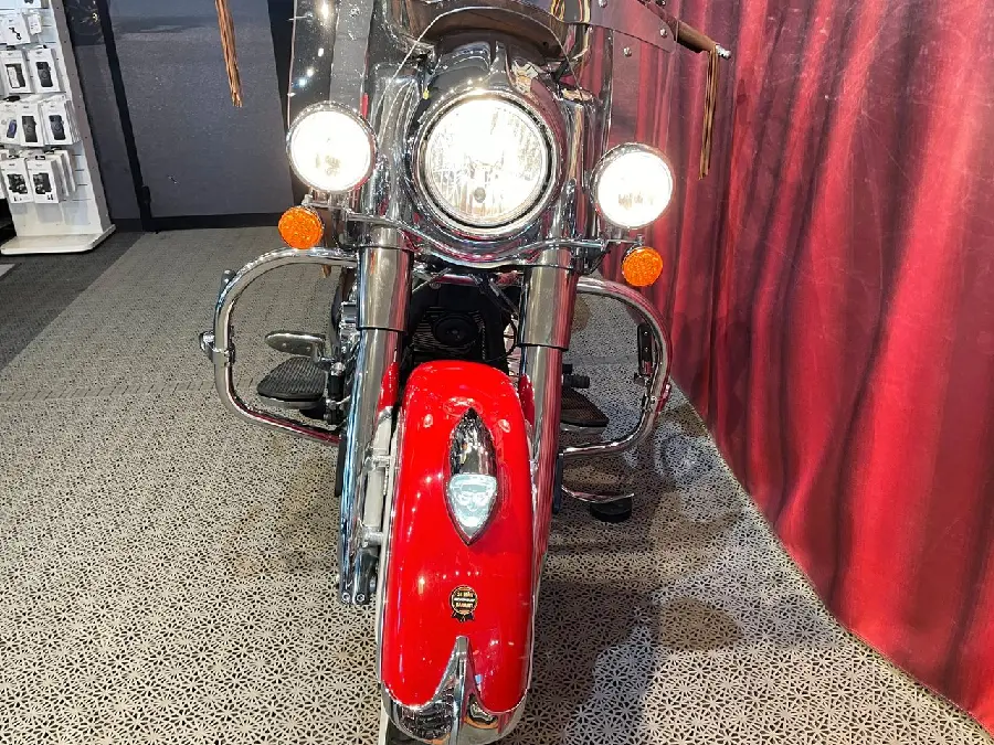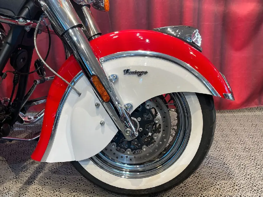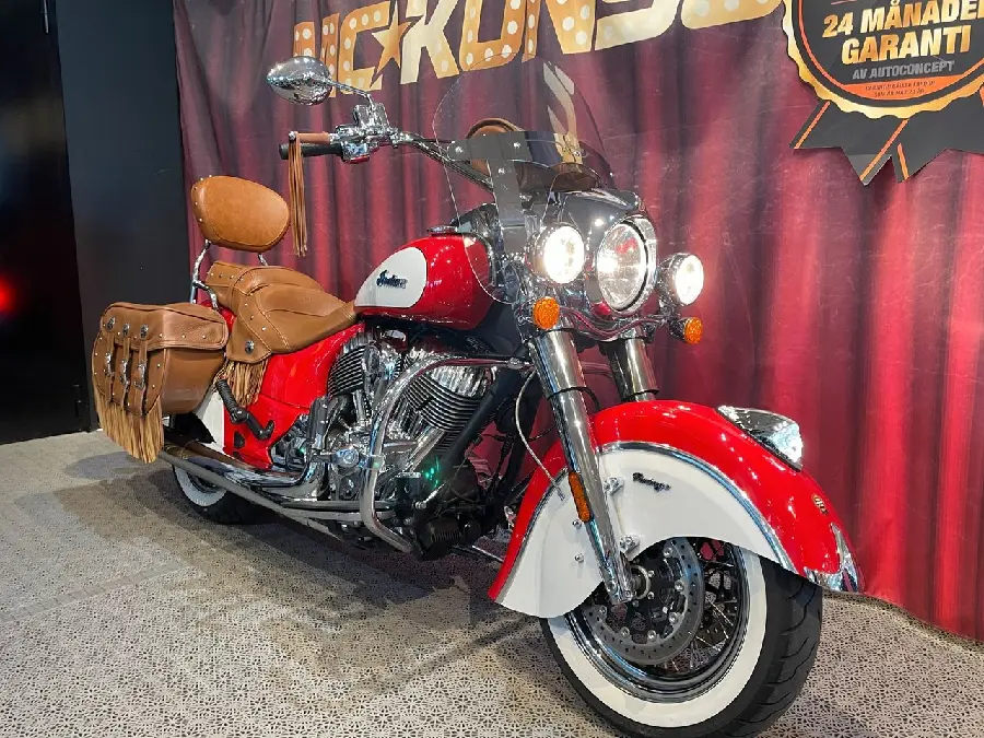 En klassisk Indian med ekerhjul och däck med vita sidor. Så otroligt snyggt! Motorbågar med Highway Pegs, läderväskor, Sissy, och upptänd Indian på framskärmen.