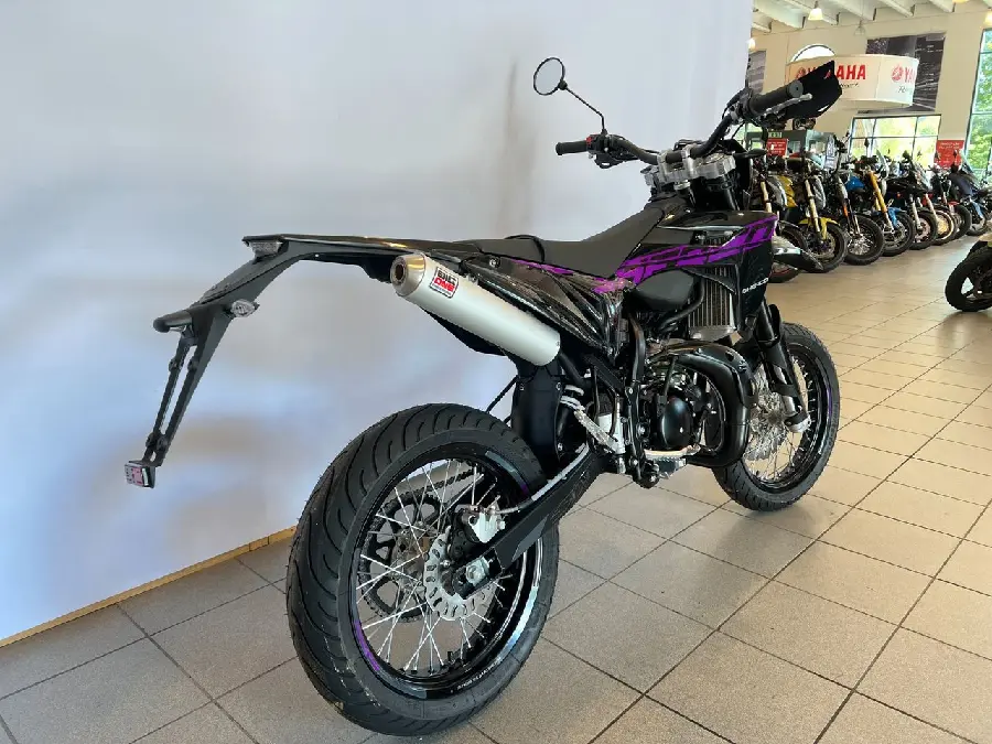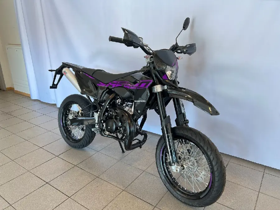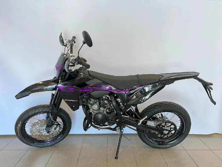 50cc SuperMotard modell med 17" fälgar skodda med greppvänliga Michelin däck. Kraftfull 300mm bromsskiva fram och rejäl fjädringsväg.