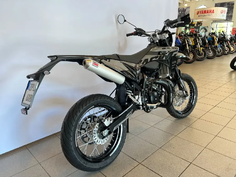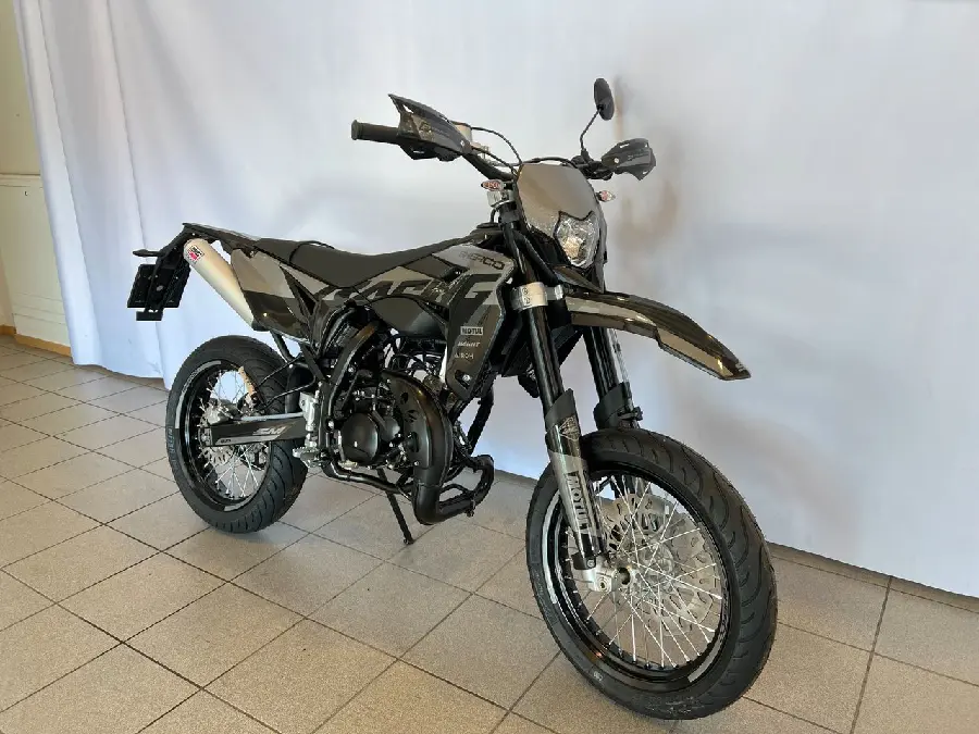 50cc SuperMotard modell med 17" fälgar skodda med greppvänliga Michelin däck. Kraftfull 300mm bromsskiva fram och rejäl fjädringsväg.