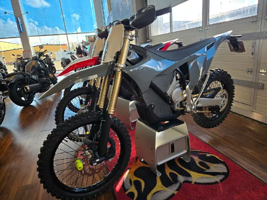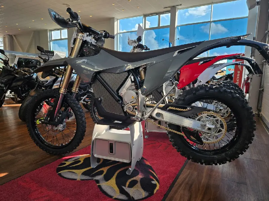 Helt nya Stark VARG EX enduro som är registrerad och du kan köra på vägen. Du kan byta kör program, anpassa och ställa in den perfekt för alla typer av banor och körstilar. Stark VARG EX har en app du kan konfigurera upp till 100 kör program och ha fem av dem aktivt installerade samtidigt på motorcykeln. Med 30 % mer kraft än en traditionell fyrtakts 450cc levererar Stark VARG en toppeffekt på 80 hk, via en drivlina som genererar 9 hk per kg samt ett vridmoment på 938 Nm på bakhjulet. Stark VARG erbjuder dig en liknande räckvidd som en 450cc med full bränsletank, men utan att förorena miljön. Batterikapacitet är på 6 kWh och en full uppladdning tar mellan 1 eller 2 timmar beroende på uttag och laddare. En fulladdad Stark VARG kan fullborda ett fullt MXGP-heat eller låta dig njuta av upp till 6 timmars lugnare körning. Inget bränsle, mer tid för körning. Vikt: 120 kg.