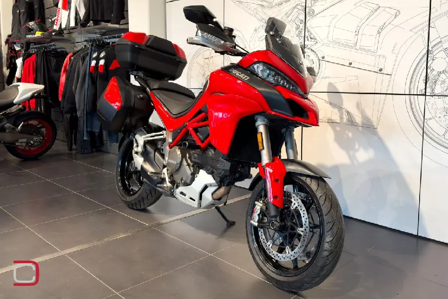 Ducati Multistrada 1200 S utrustad med sidoväskor, topbox med ryggstöd, handguards, hasplåt, centralstöd och tankväska (syns ej på bild).
