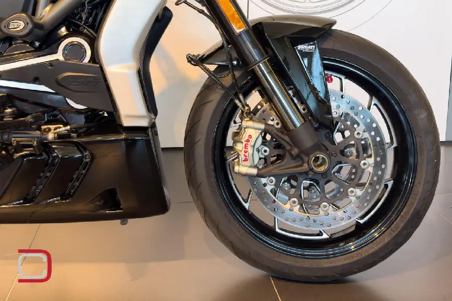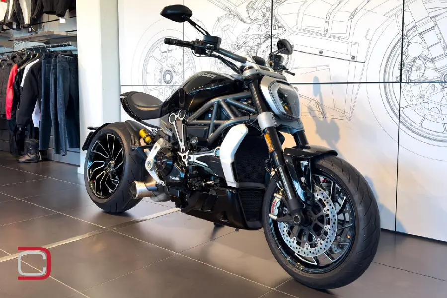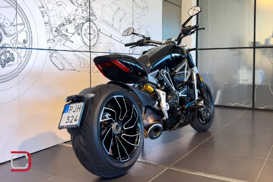 Ducati XDiavel S utrustad med bland annat Termignoni helsystem ink mappning, Öhlinsfjädring bak, Translogic Quickshift, värmehandtag, justerbara körlägen, ABS och farthållare.