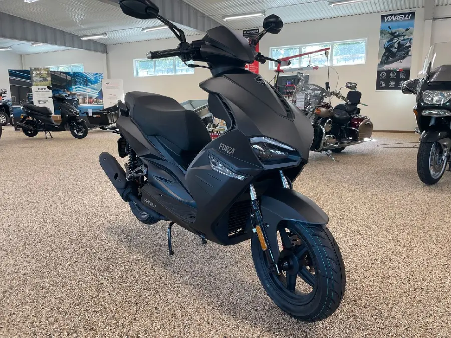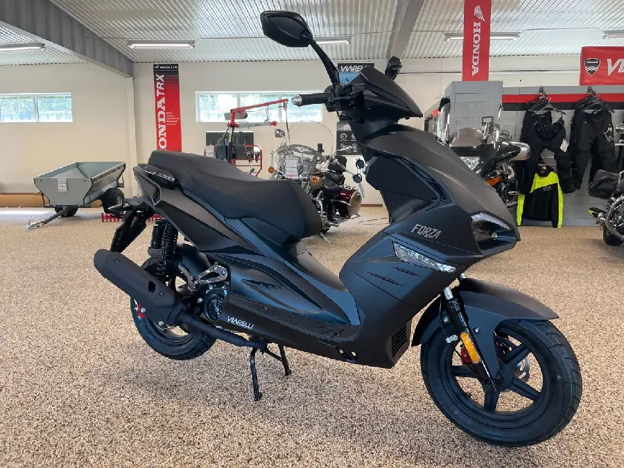Viarelli Forza är den ultimata sportmopeden för dig som värdesätter looken och känslan. Inspirerad av italiensk design och byggd med den senaste teknologin, är Forza här för att utstråla självförtroende ute på vägarna. Dess mattsvarta kaross i kombination med race-röda detaljer ger en aggressiv och modern look, medan de skarpa linjerna hämtade från italienska superbilar fulländar den sportiga estetiken. Oavsett om du pendlar till skolan, cruisar genom stan eller tar en tur med vänner, levererar Forza en körupplevelse som både känns och ser exklusiv ut.