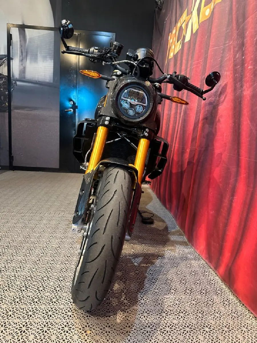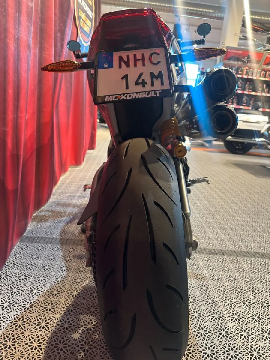 I stort sett ny hoj, uttagen i maj -25 med bara ca 20 glasskiosk-mil på mätaren. Värstingen bland FTR:erna med Öhlins, carbon överallt och absolut coolaste avgassystemet från S&S. Original medföljer.