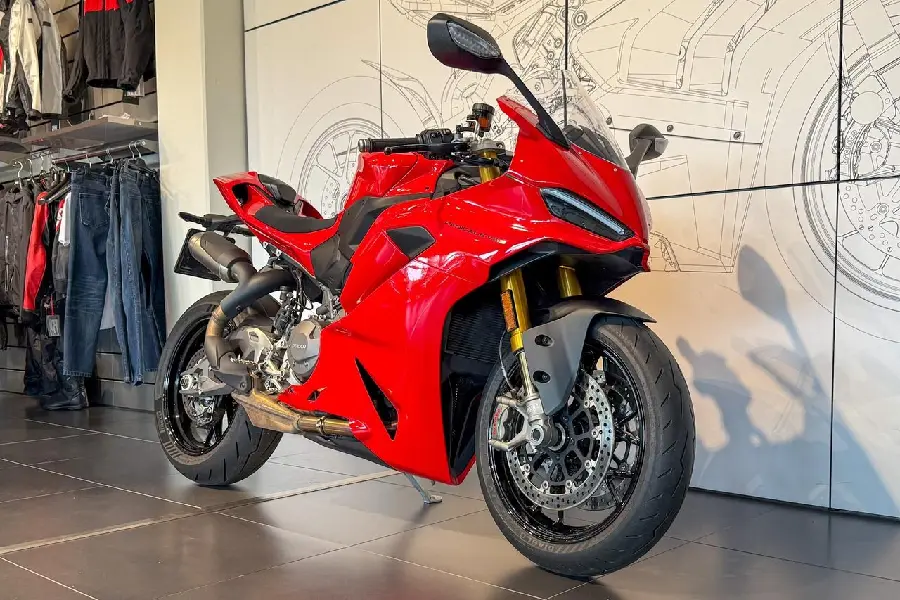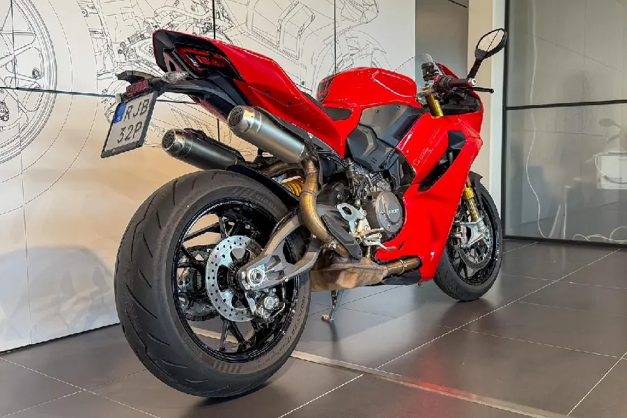 Får vi lov att presentera helt nya Panigale V2 2025! Detta är S versionen med Öhlinsfjädring både fram/bak. Hela 17 kg lättare än sin föregångare med en vikt på 176 kg och den nya motorn levererar 120 hk.
