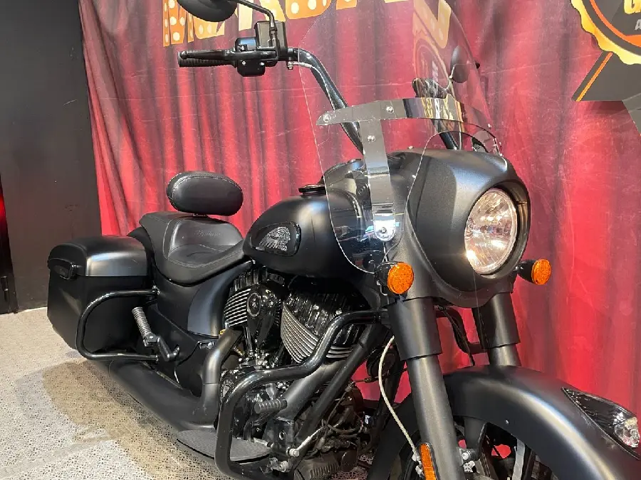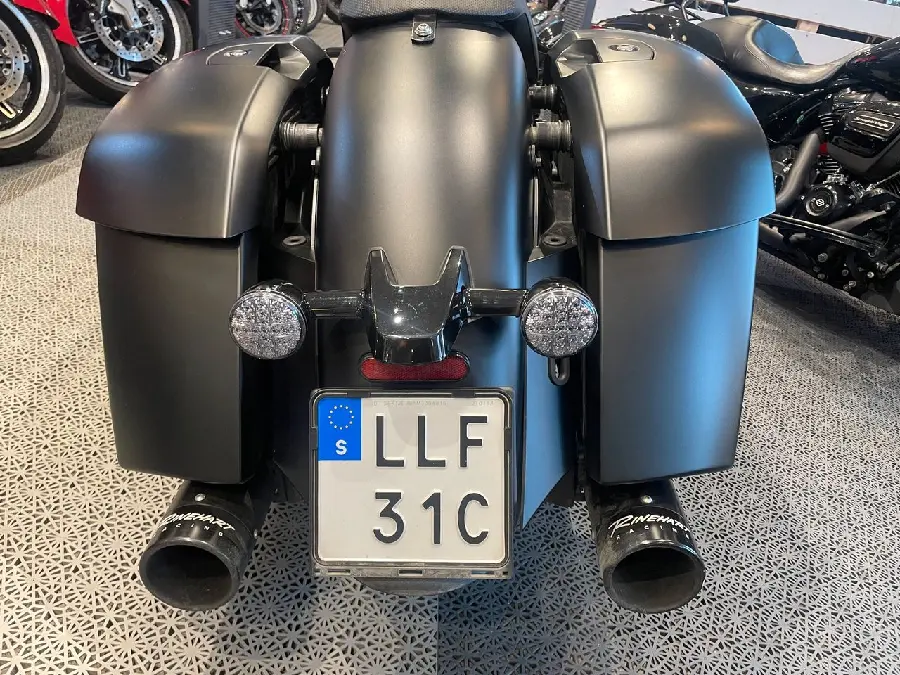 Den luftkylda Thunderstroke 116-motorn, påhejad av Slip-On från Rinehart mullrar gött på denna svarta Springfield Dark Horse. Det höga styret ger en komfortabel sittställning, och gör detta till en riktigt skön Touringhoj. Nyligen servad, och nästa besiktning 2027-04-30.