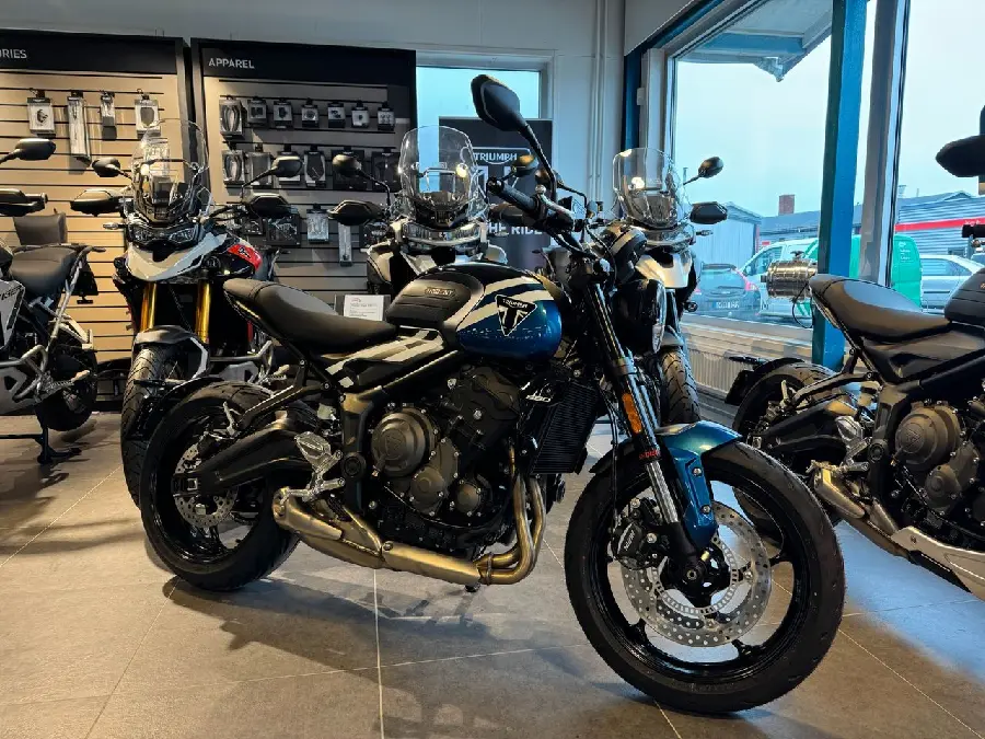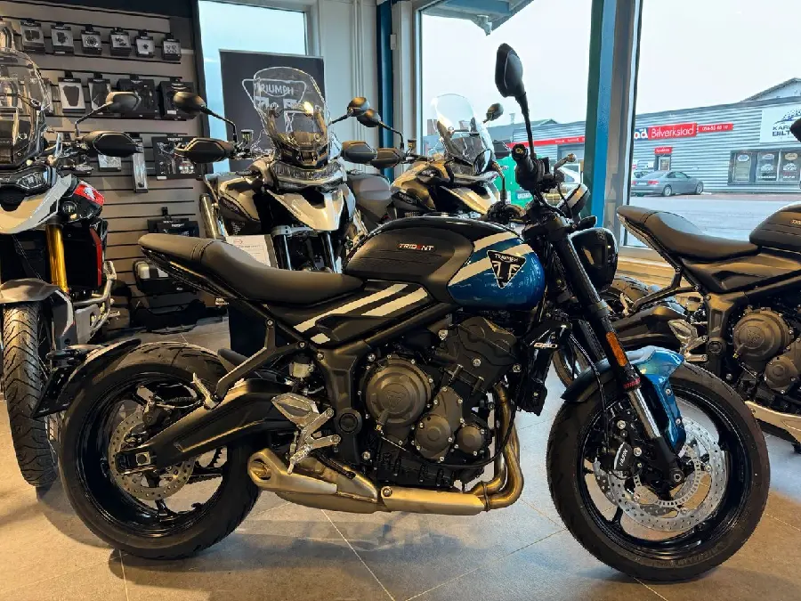Nu säljer vi vår demo Triumph Trident 660 i färgen Cobalt Blue som bara gått 13 mil.