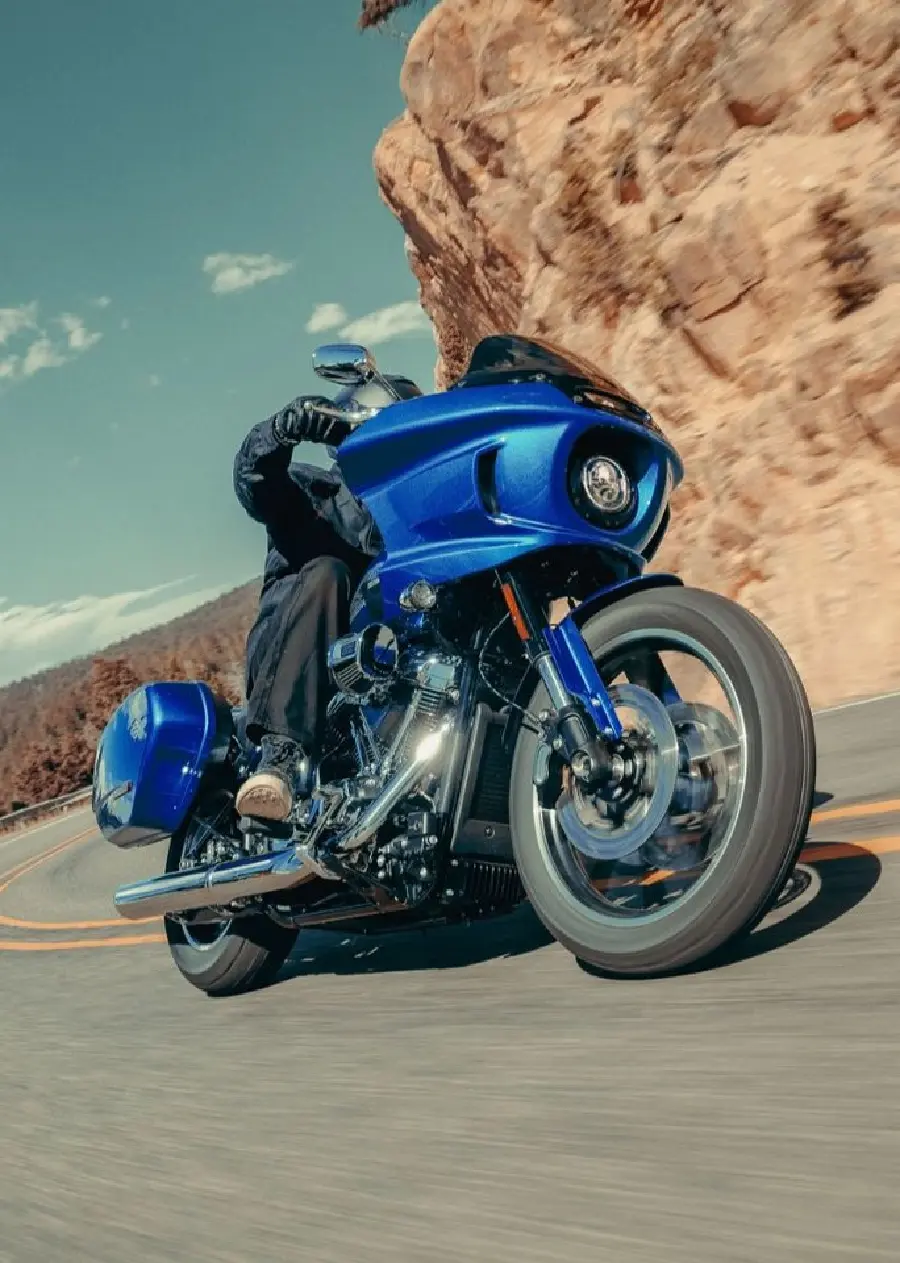 Harley-Davidson Low Rider® ST 2025 i Blue Burst med kromad motor och Milwaukee-Eight® 117 High Output-motor erbjuder en tidlös och kraftfull design. Den djupa blåa finishen och den glänsande kromade motorn ger en aggressiv och exklusiv look.