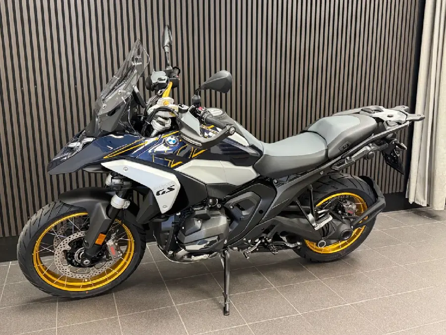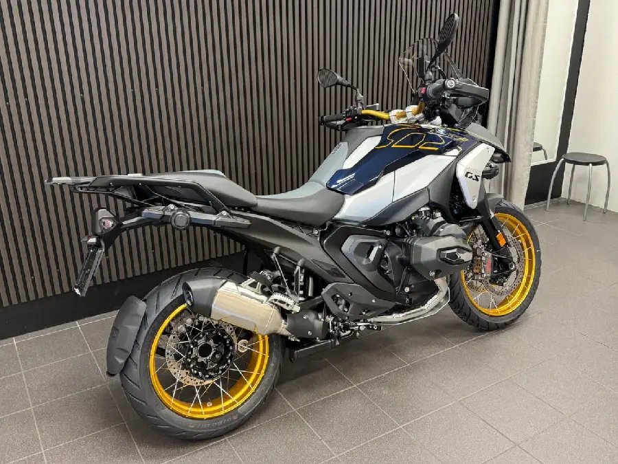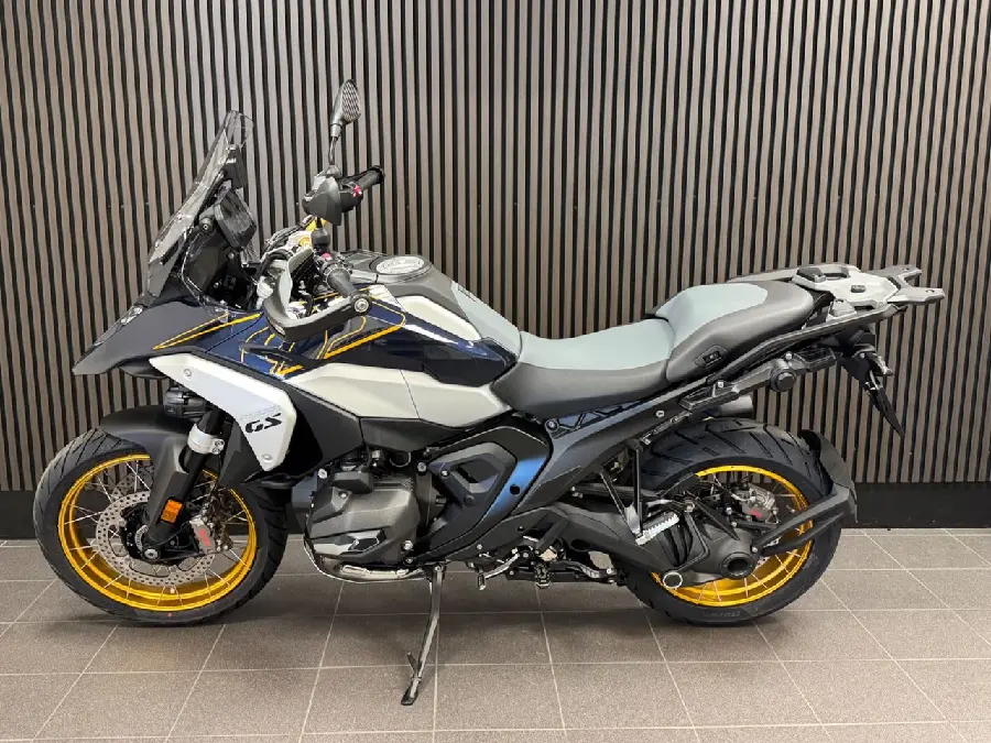 Utrustning: Option 719 (Passenger kit. Windscreen el. adjustable. Main stand. Comfort riders seat. Cross spoke wheels golden. Option 719 Billet Pack Shadow. Touring package (Preparation for GPS device. Chromed exhaust pipe. Central locking system. Hand protector extension. Case holders). Dynamic package (DSA. Gear shift assistent Pro. Riding modes Pro. Sports brake). Innovation package (Headlight Pro. Adaptive light modes. Rear collision warning. Riding assistant). Adaptive vehicle height control. Seat heating. Additional fog light. Anti theft alarm system. Topcase carrier. Intelligent emergency... call. (R1300. R 1300. R 1300 GS)