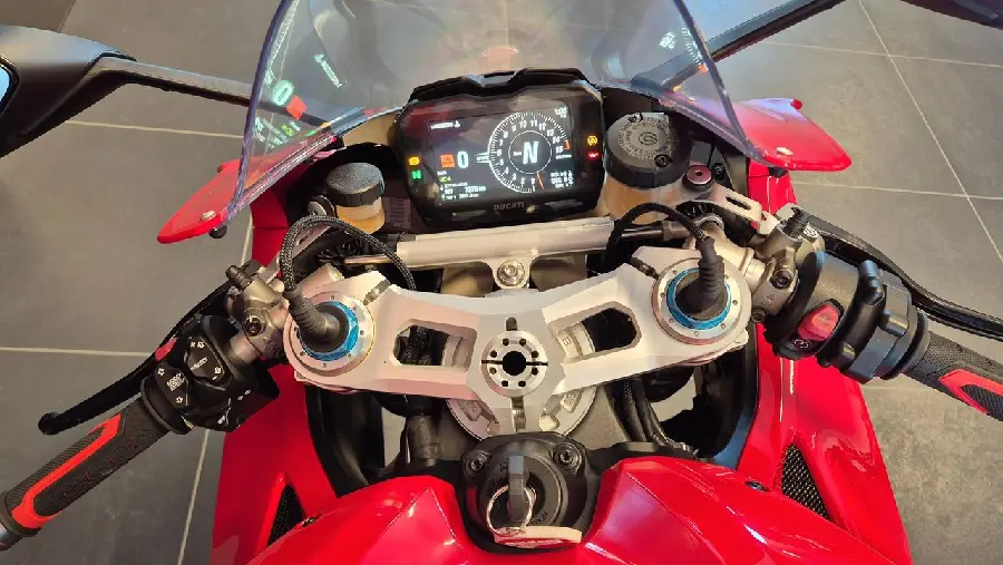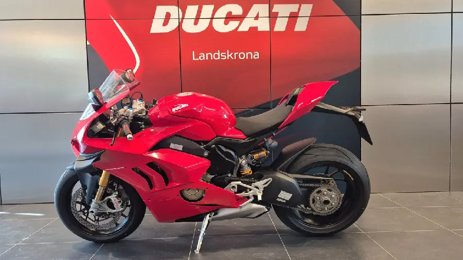 V4 desmodromisk motor på 1103 cc och 214 hk. Motroterande vevaxel. Ducati Quick Shift. Riding Modes. Power Modes. Bosch Cornering ABS EVO. Ducati Traction Control. Ducati Wheelie Control. Ducati Slide Control. Engine Brake Control. Auto tyre calibration. Electronic Suspension med Öhlins fjädring och styrdämpare. Lithium-ion batteri. Smidda Marchesini aluminium fälgar m.m. 2.400 mils service intervall. 214 hk@13.000 v/min. 124 Nm@10.000 v/min. 174 kg (torrvikt • Ducati Red with grey frame and black wheels •Latest-generation electronic package with 6-axis Inertial Measurement Unit (6D IMU): ABS Cornering Bosch EVO; Ducati Traction Control EVO (DTC EVO). Ducati Slide Control (DSC). Ducati Wheelie Control EVO (DWC EVO). Ducati Power Launch (DPL). Ducati Quick Shift up/down EVO (DQS EVO). Engine Brake Control EVO (EBC EVO) •Riding Modes (Race. Sport. Street) •5" full-TFT dashboard •Braking system with new Brembo Stylema® monobloc calipers •New Pirelli Diablo Supercorsa SP tyres. 200/60 at the rear