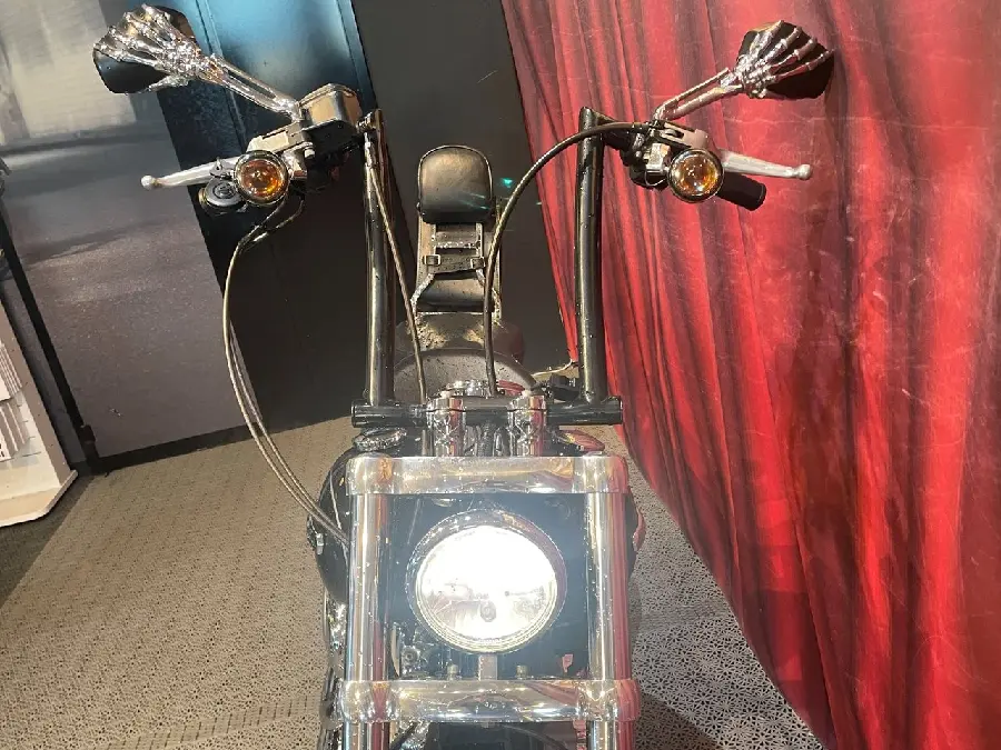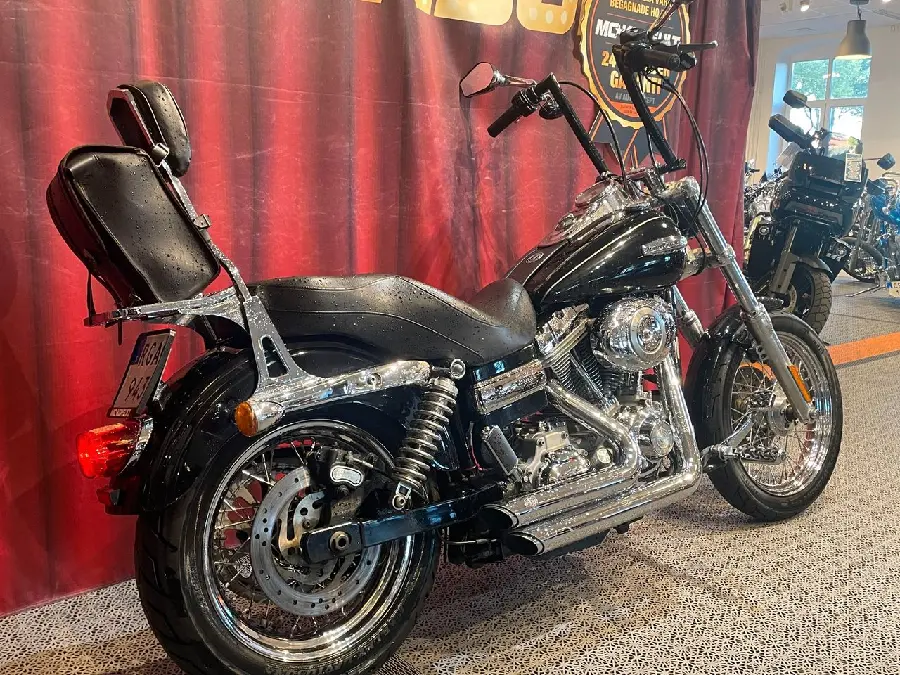 Super Glide Custom med högt styre, Sissy med pakethållare och väska, Vance&Hines. Ekerhjul, svart lackering och Chrome, en klassisk kombo!