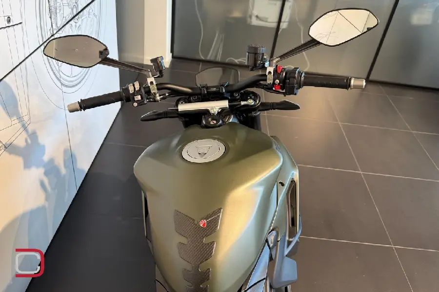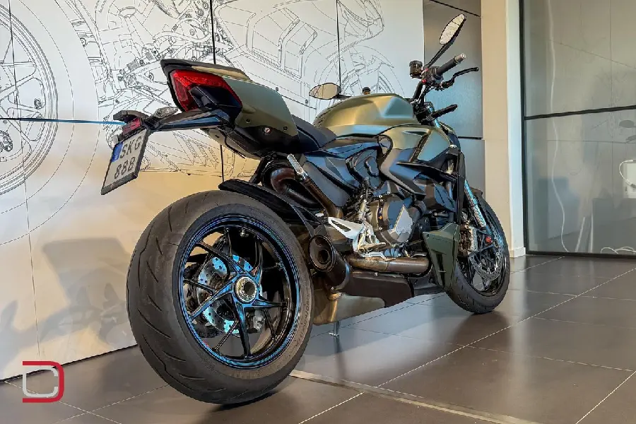 Ducati Streetfighter V2 utrustad med bland annat carbon tank pad, quickshift upp och ner, ABS, Kurv-ABS, anti-spinn, svartlackade detaljer och kylarskyddsgaller från CNC racing.