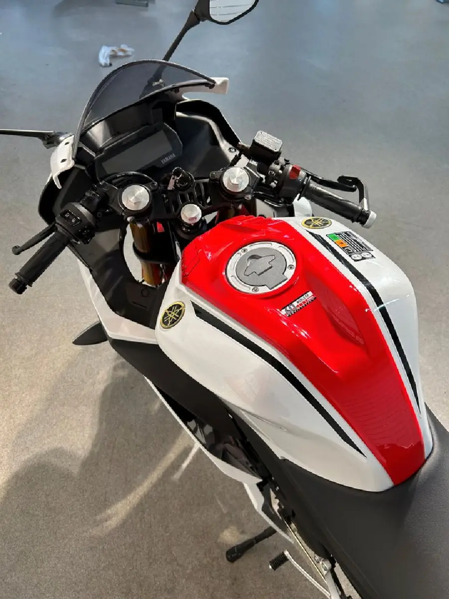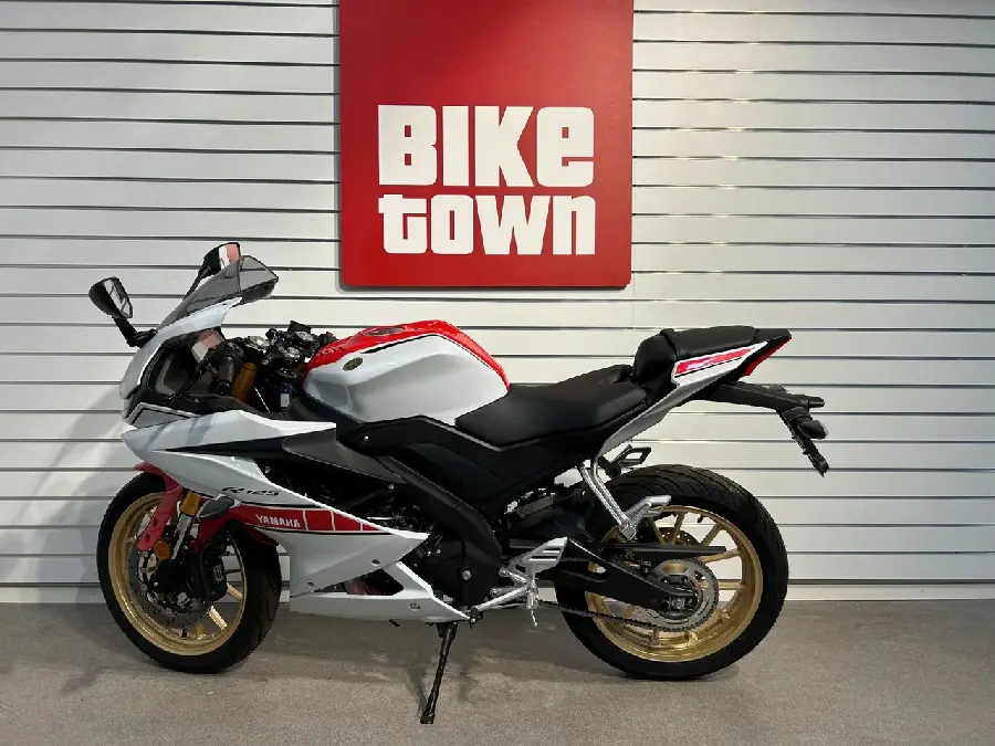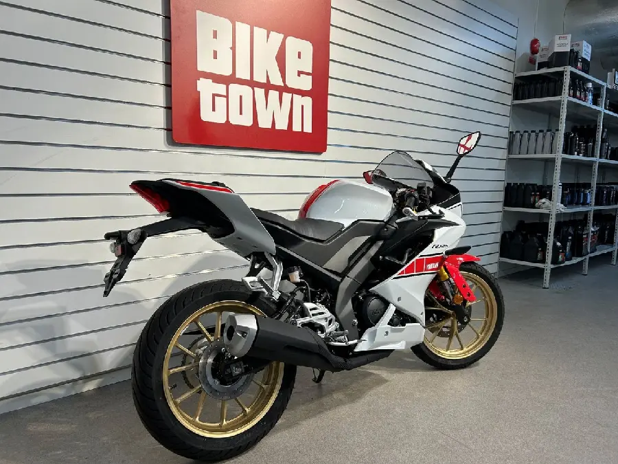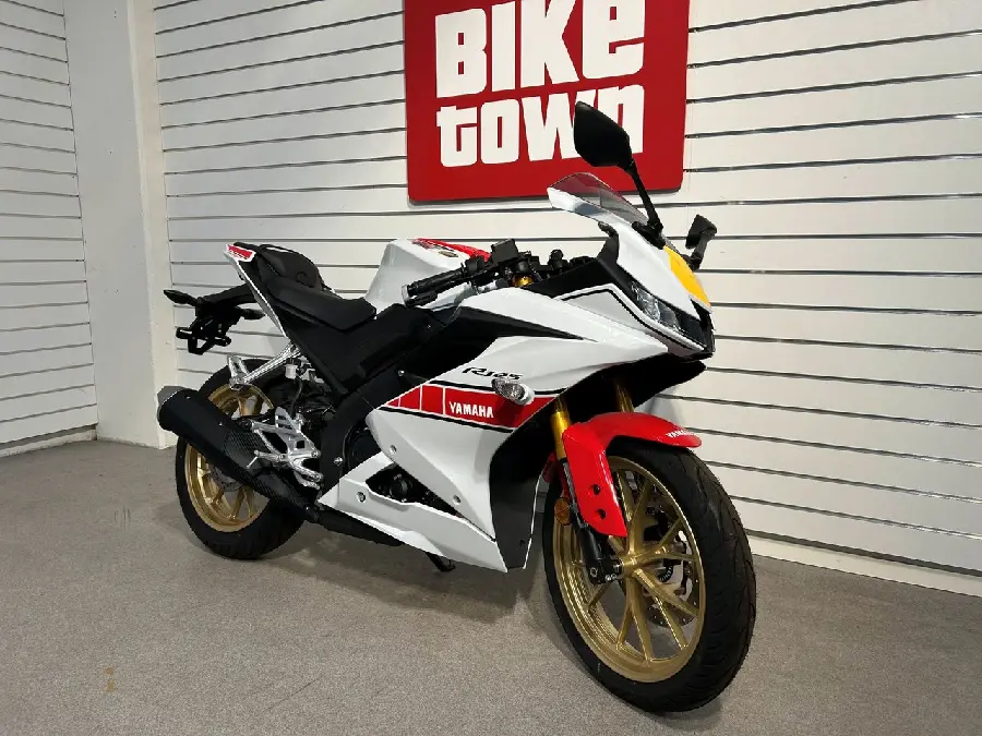 Till salu: Yamaha R125 World GP 60th Anniversary, årsmodell 2022. Denna jubileumsmodell hyllar Yamahas racinghistoria och är helt ny med 0 mil på mätaren. Hojen har en 125cc, vätskekyld fyrtaktsmotor med kedjedrift och manuell växellåda.