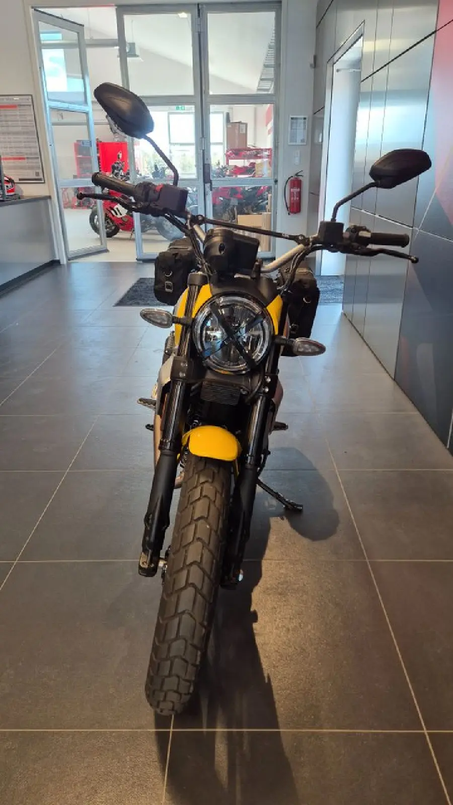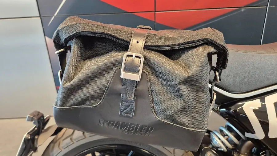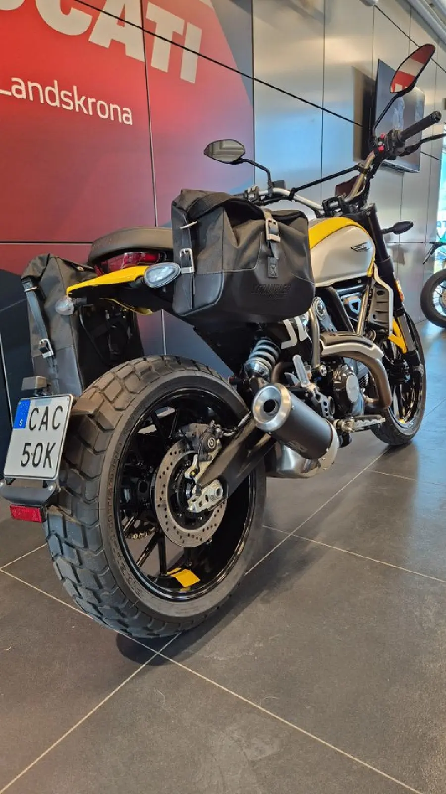 Extrautrustad med Ducati Original Scrambler sidoväskor, Desert Sled fotpinnar ( original följer med ), fågelpinne och kylarskydd mm.