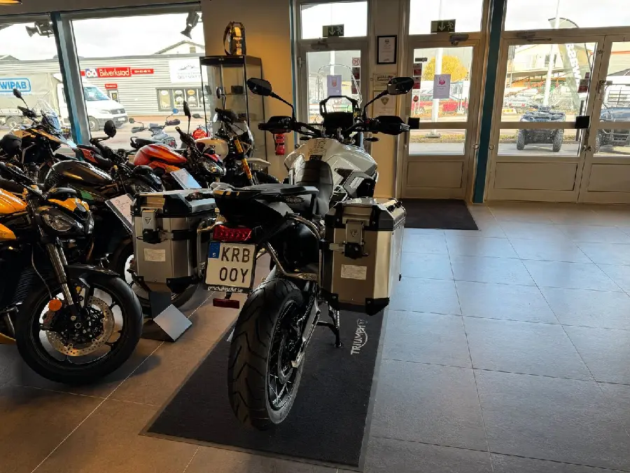Nu har vi utrustat en Tiger 900 Rally Pro i färgen Snowdonia/Graphite med aluminium-sidoväskor och rallyfotpinnar i aluminium för bättre fäste.