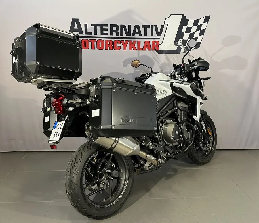 Triumph Tiger 1200 Alpine Edition från 2020 med 1552 mil på mätaren. Extrautrustad med : Alla tre väskorna i svart från Triumph. Tankväska från Triumph (ej med på bilderna). Lyktskydd. Motorbågar. Triumphs stora Tiger med en unik design i Snowdonia White (Alpine Edition) tar dig med på oändliga äventyr. En härlig mc på både kortare turer och långresor. Standardutrustningen innehåller bl.a : Triplemotor på 141 hk med 6 växlar. Arrow ljuddämpare. 20 l tank. Elektriskt justerbar fjädring. 5 tums TFT-skärm i färg. Aluminiumfälgar. Brembobromsar. Växelassistent. Farthållare. HillHold. LED-belysning.... Kurv-ABS och kurv-TC. 4 körlägen. Bakgrundsbelysta knappar. Elektrisk vindruta. 5V USB-uttag. Nyckellös tändning. Handtagsskydd. Senast servad mars 2025 vid 1295 mil. Besiktigad till august 2026. Manual och extranycklar. #Triumph #Triumph Tiger #Tiger 1200 #Tiger1200 #1200 XRX #XRX #1200XRX #Touring #Adventure #1200 #Kardan #CJG35Y #CJG #35Y