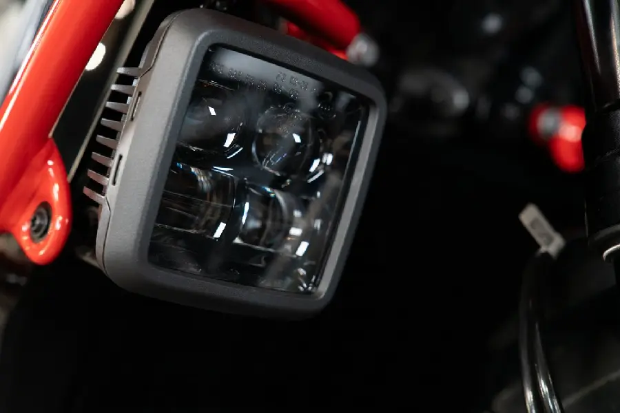 Den karakteristiska, adaptiva strålkastaren använder en tröghetsmätare för att mäta lutningsvinkeln och projicera mer starkt, vitt ljus i förarens väg.