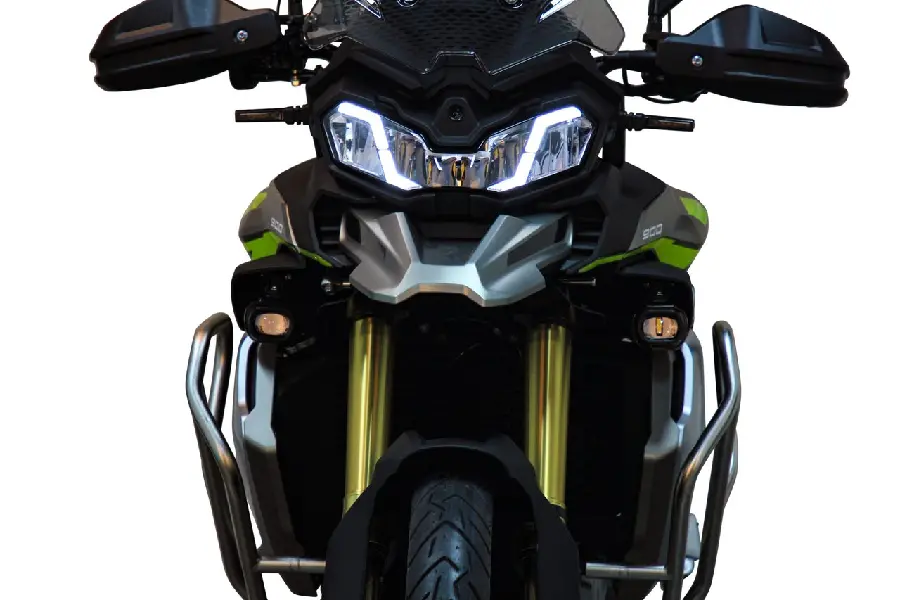 Med sin tuffa adventure-design, en justerbar vindruta och en robust pakethållare, är Voge DS900X fullt redo för alla äventyr. Hojen är också utrustad med med skyddsbågar och hasplåt. Även centralstöd ingår.