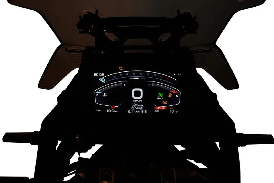 Den 7-tums stora TFT-färgskärmen erbjuder Bluetooth-anslutning, GPS-integration och ett realtidsövervakningssystem för däcktryck (TPMS).