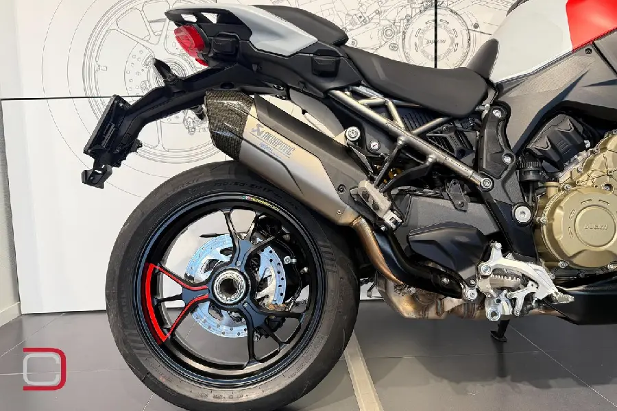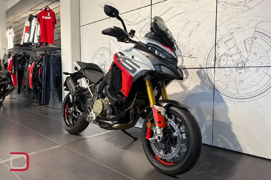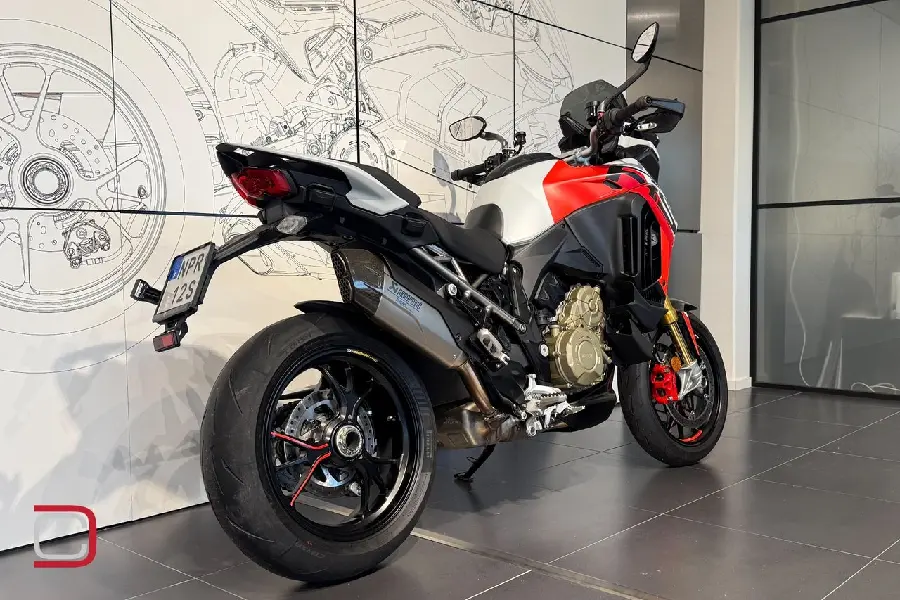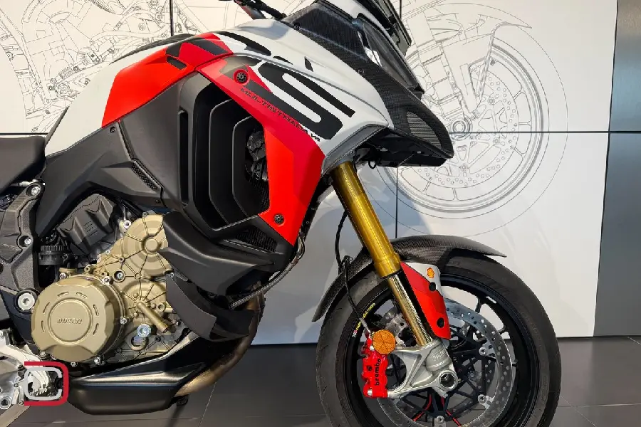 Ducati Multistrada V4 RS utrustad med bland annat Akrapovic slipon, semiaktiv fjädring från Öhlins fram och bak, bakram i titan, Brembo-bromsar och kolfiberdetaljer.