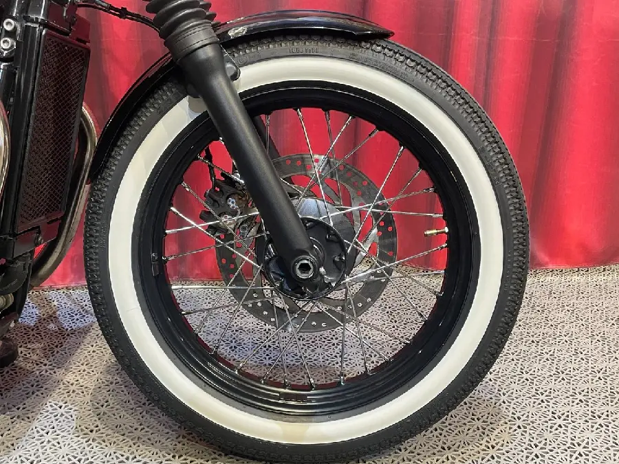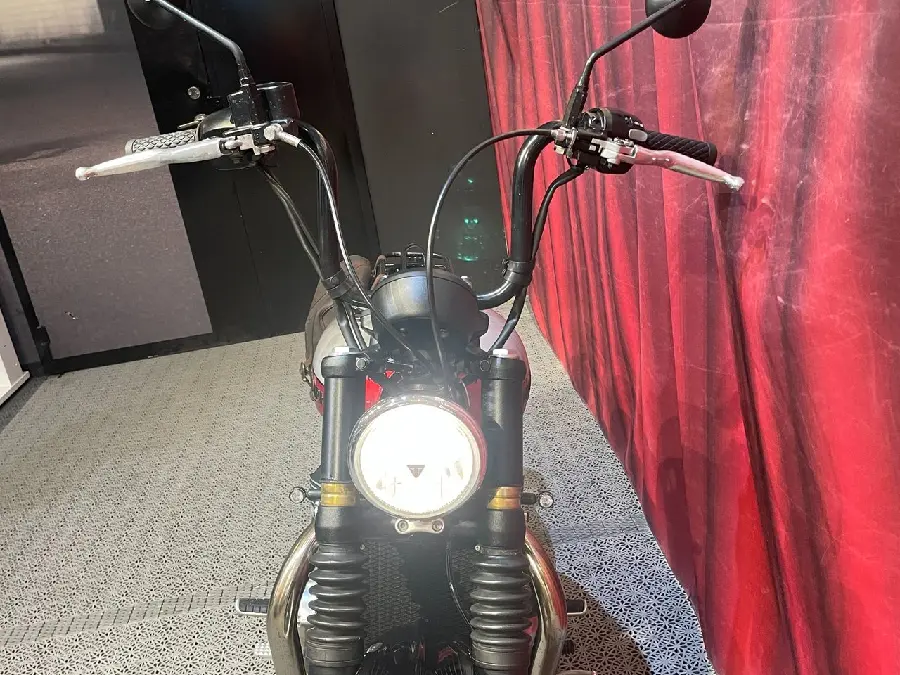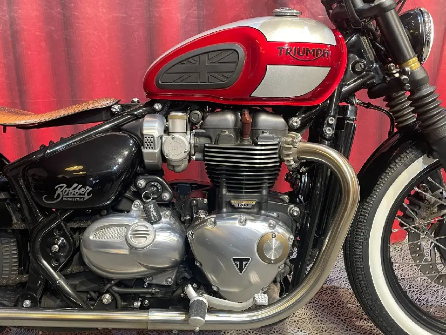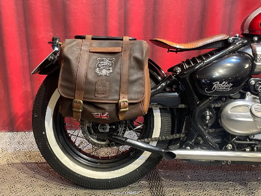 Bonneville Bobber med det rätta stuket! Sadel med ormskinn, högt styre, raka rör, ekerhjul, däck med vita sidor, miniblinkers, mjuk väska på höger sida, pakethållare, originaldelar medföljer. ABS, såld ny av oss, vi gör service på den innan leverans. 24 månader garanti genom https://www.autoconcept.se