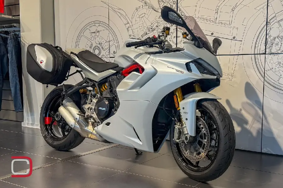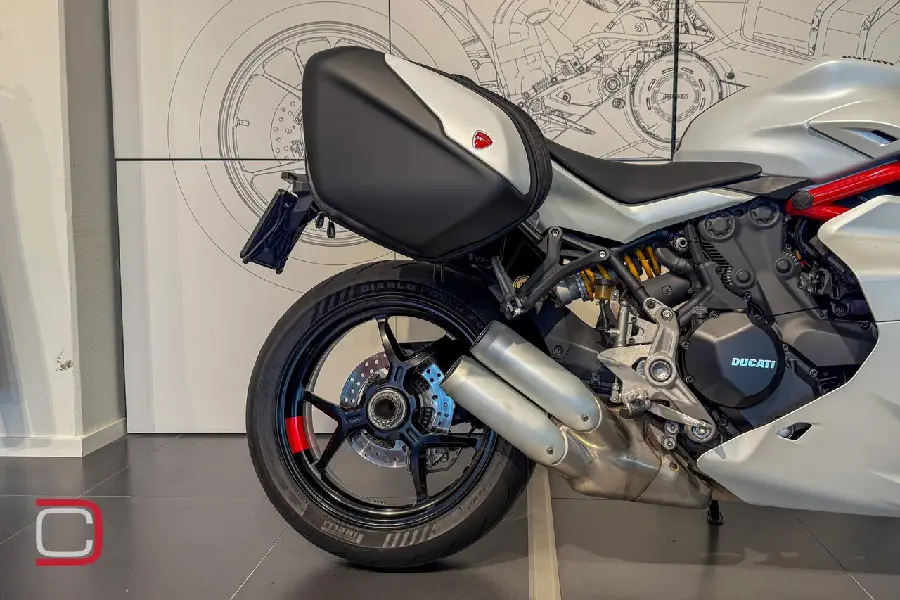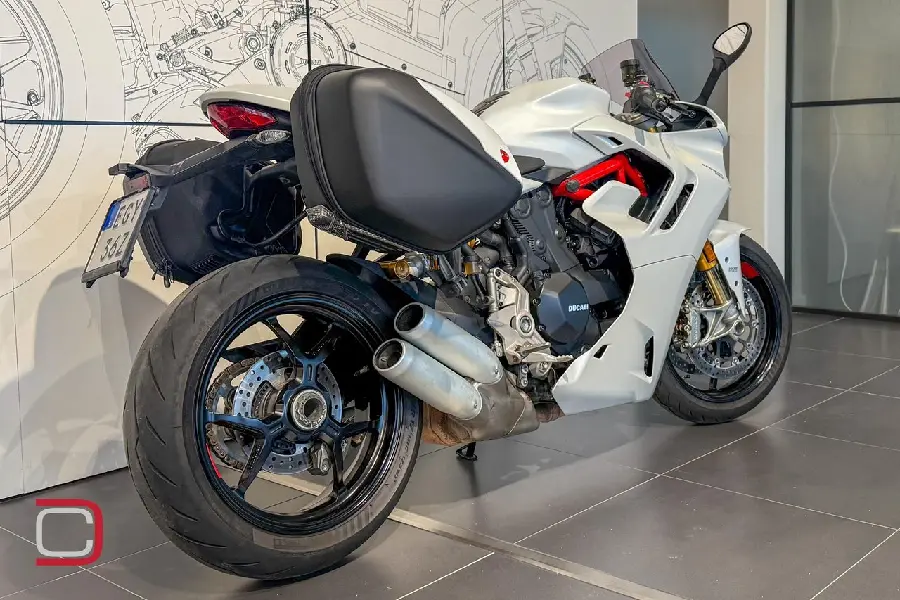 Ducati Supersport 950 S utrustad med bland annat touringpaket som innehåller sidoväskor, värmehandtag och större tonad ruta, kylarskyddsgaller, quickshift, körlägen och Öhlinsfjädring fram och bak.