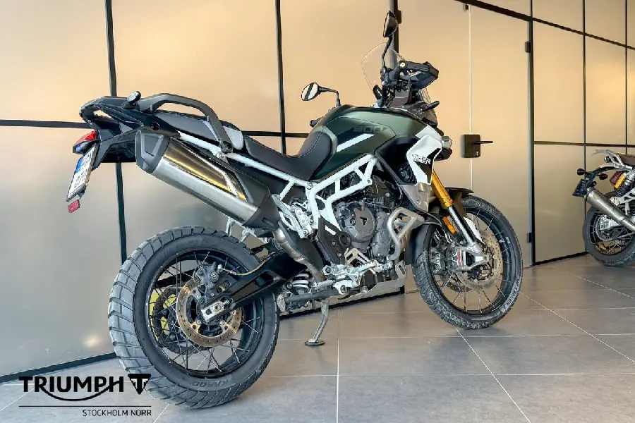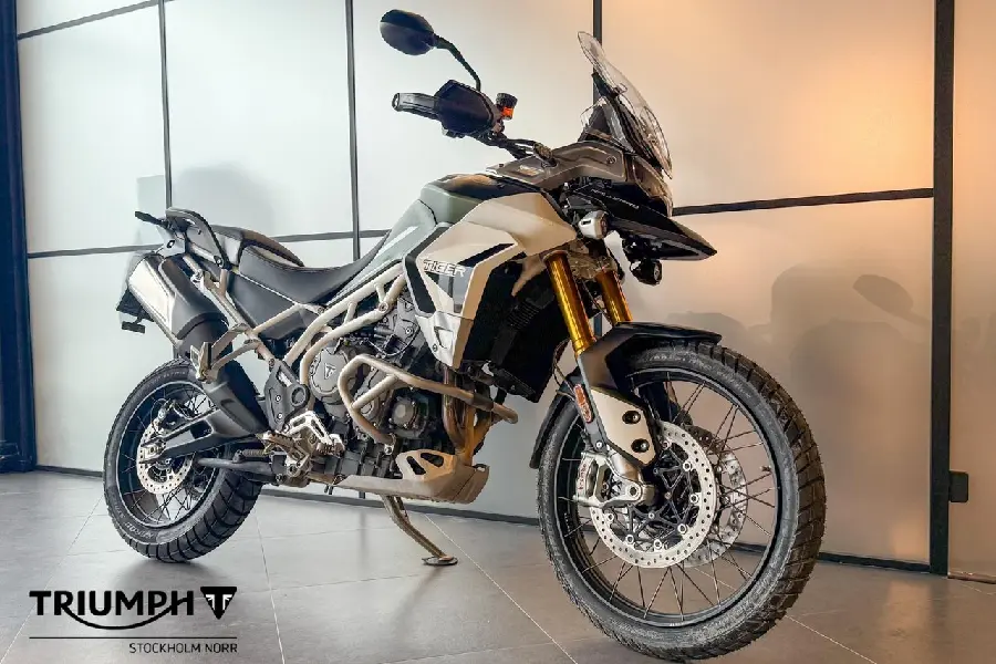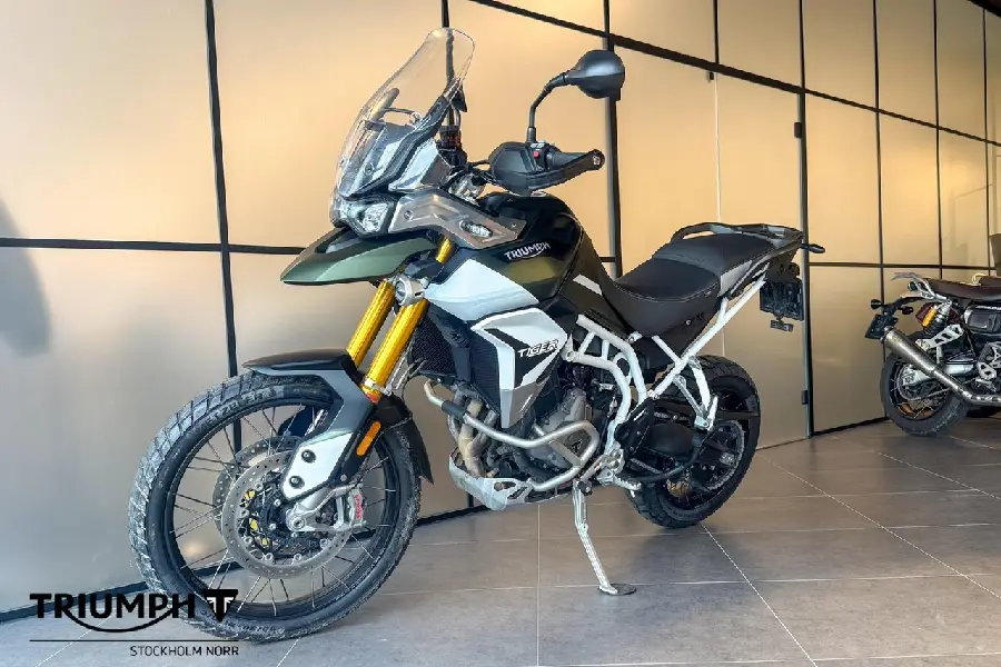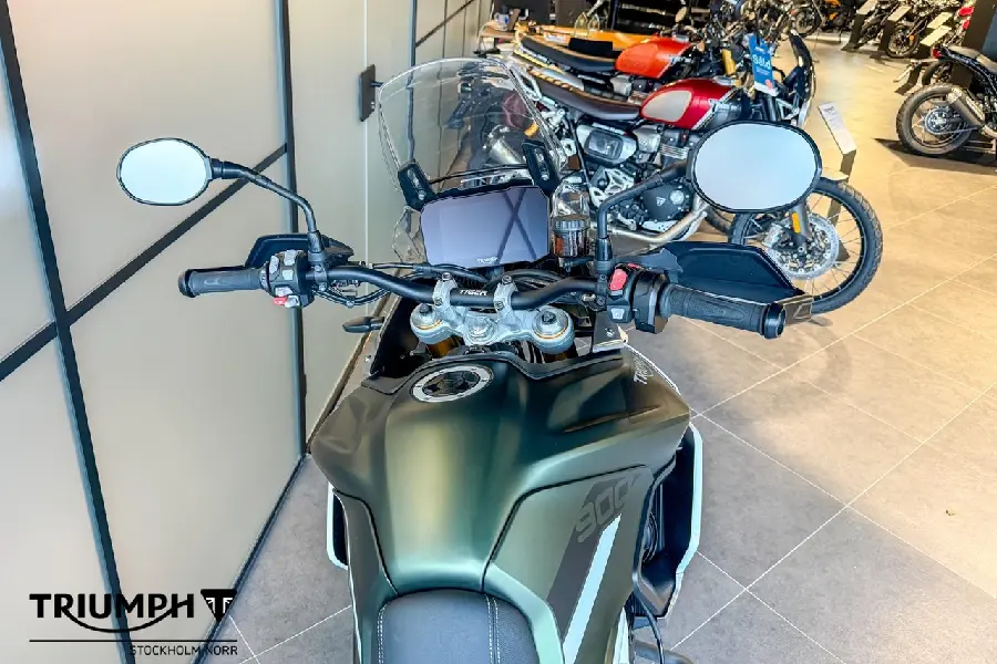 Triumph Tiger 900 Rally Pro utrustad med bland annat farthållare, motorbågar, hasplåt, Brembo-bromsar, blåtandsmodul, justerbara körlägen, justerbar sadel med värme, justerbar ruta, handtagsvärmare, handguards, uppvärmd passagerarsadel, quickshift upp och ned, centralstöd och ABS.