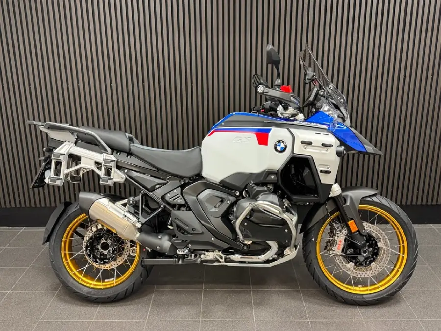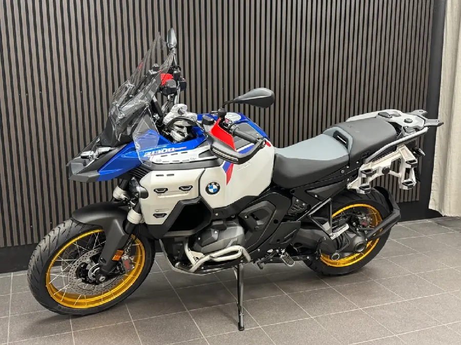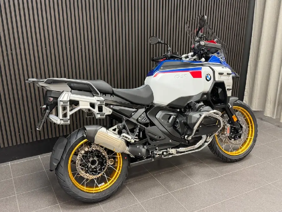 Utrustning: GS Trophy. Cross spoke wheels golden. Adaptive vehicle height control. Touring package (Preparation for GPS device. Chromed exhaust pipe. Windscreen el. adjustable. Main stand. Case holder for aluminium cases). Dynamic package (Gear shift assistent Pro. Riding modes Pro. Sports brake). Innovation package (Headlight Pro. Adaptive light modes. Rear collision warning. Riding assistant). High Windshield. Anti theft alarm system. Topcase carrier. Intelligent emergency call. Comfort riders seat. Comfort passenger seat. (R1300GS Adventure. R1300GS A. R1300 GSA. R 1300 GSA)