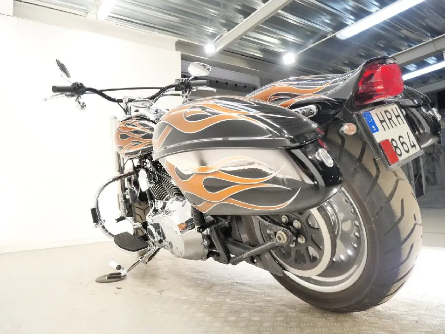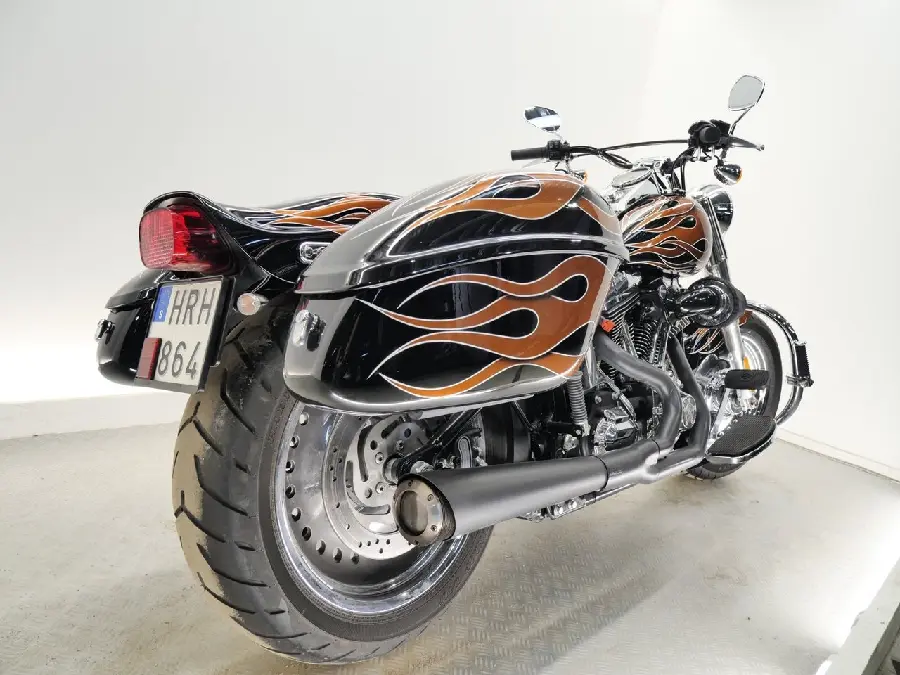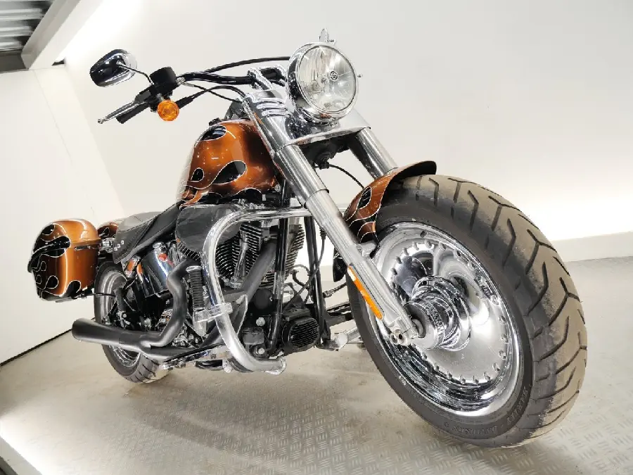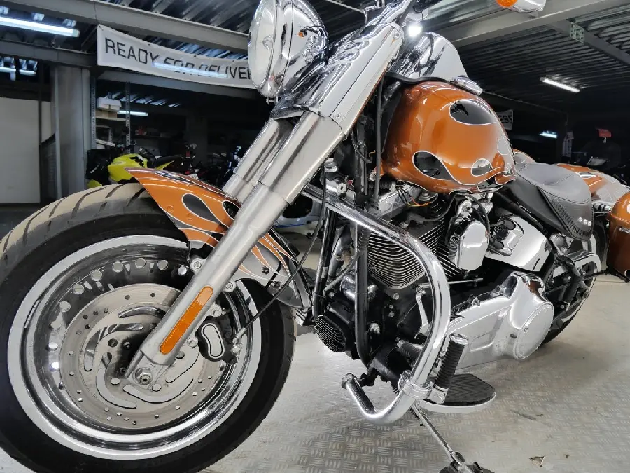 En Fatboy i toppskick. Endast 1650 mil och en ägare. Proffslackad med kopparfärgade flammor på svart botten. Original tillbehörsväskor, Heavy Breather m.m. Avplocksdelarna finns och följer med i köpet.Vi har butiker i Stockholm, Göteborg och Malmö och kan transportera över hela landet.