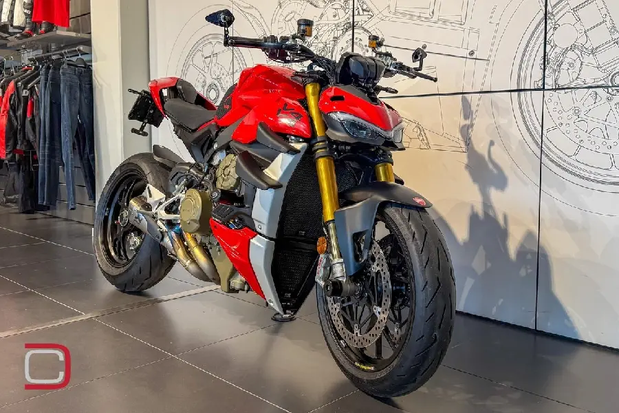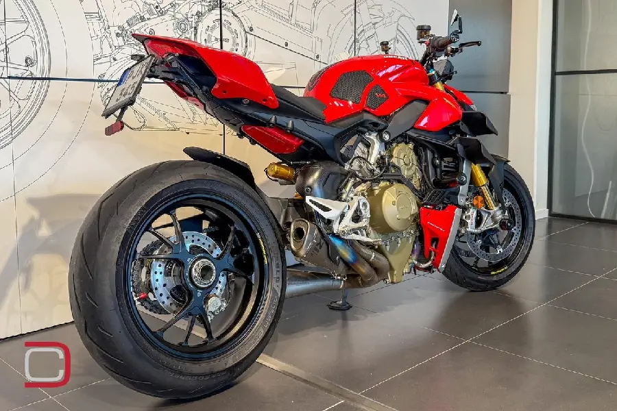 Ducati Streetfighter V4 S utrustad med bland annat Akrapovic helsystem med tillhörande mappning och grenrörsskydd i kolfiber, single seat, tailtidy från Rizoma, miniblinkers fram & bak från Rizoma, bar end mirrors från Moto Gadget, värmehandtag, kylarskyddsgaller från CNC racing, kraschpuckar från RG racing, front fork slider, knee pads och en tank pad.