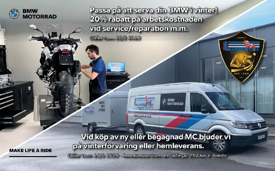 Vi är auktoriserad BMW-återförsäljare med stort tillbehörssortiment och egen välutrustad verkstad för service, reparationer och försäkringskador. Hos oss hittar du ett stort urval av nya och begagnade motorcyklar i form av Offroad, Touring, Sport, Custom, Super motard. Från och med 2019 säljer och servar vi även Peugeot mopeder.