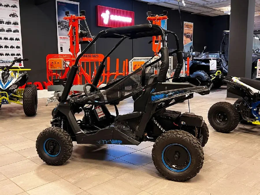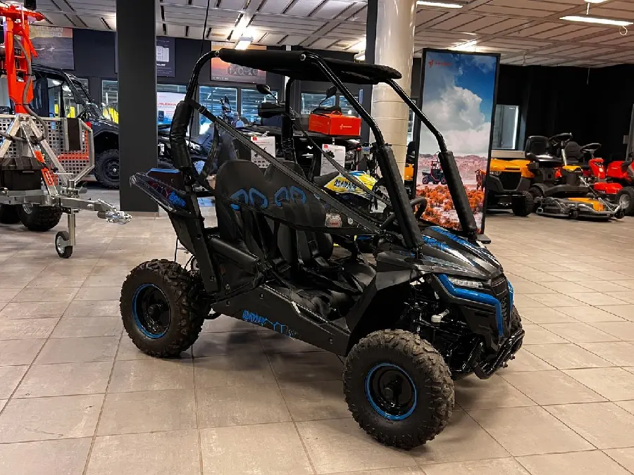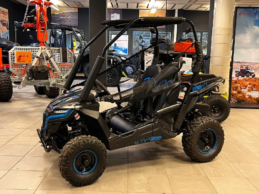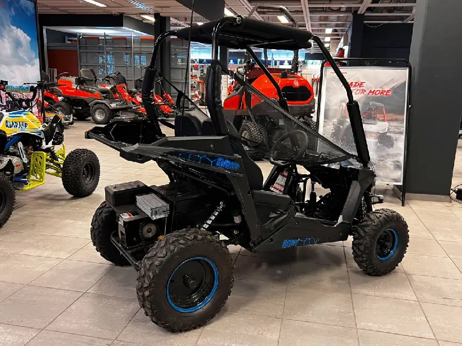 K1E är en 100% elektrisk fyrhjuling med plats för 2 barn. Trygg och säker med skyddsbur och kraftiga 4-punktsbälten på båda platserna. Kraftfullt batteri med lång körtid på drygt 2 timmar på en laddning (beroende på förhållanden). Laddas enkelt i vanligt vägguttag. Laddare medföljer.
